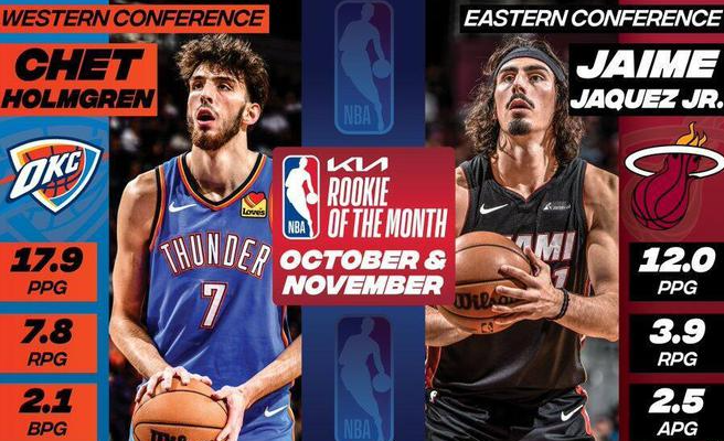 北京时间12月5日,NBA官方公布了10月-11月的月最佳球员、月最佳新秀和月最佳教练的奖项。凯尔特人的塔图姆和掘金的约基奇当选东西部月最佳球员。热火的小海梅-哈克斯和雷霆的切特-霍姆格伦当选东西部月最佳新秀。魔术的莫斯利与森林狼的芬奇当选东西部月最佳教练。